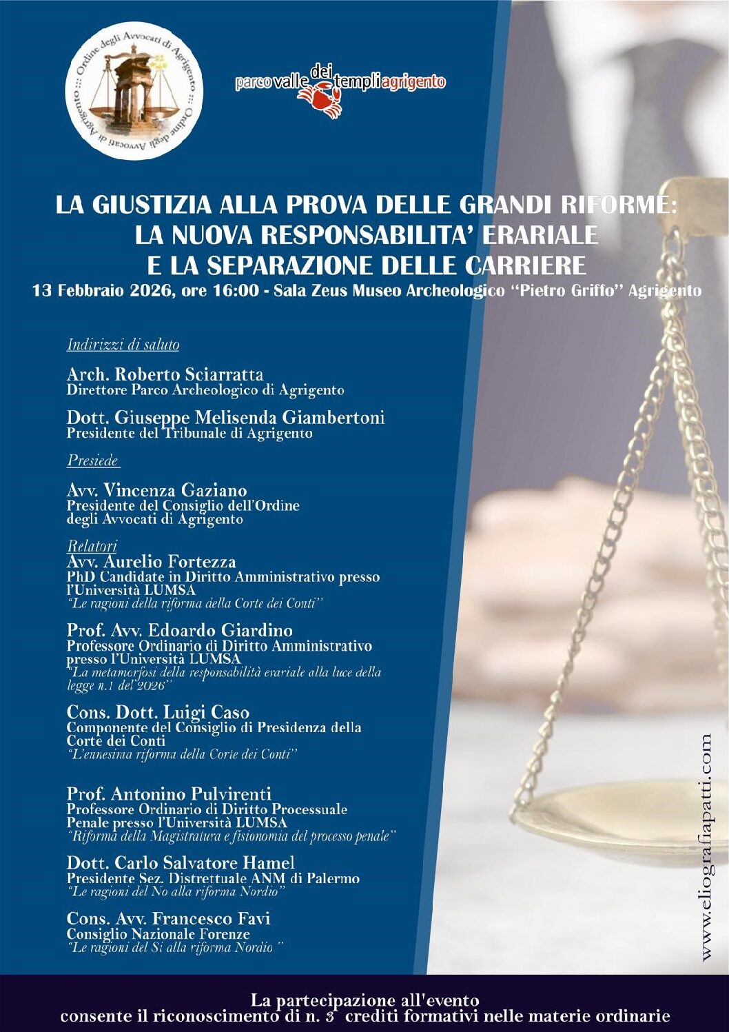 L'evento formativo "La Giustizia alla prova delle grandi riforme: responsabilità erariale e separazione delle carriere", organizzato dal Consiglio dell'Ordine degli Avvocati di Agrigento, si terrà giorno 13 febbraio, alle ore 16.30, presso la Sala Zeus del Museo P. Griffo di Agrigento La partecipazione all'evento consente il riconoscimento di n. 3 crediti formativi nelle materie ordinarie. […]