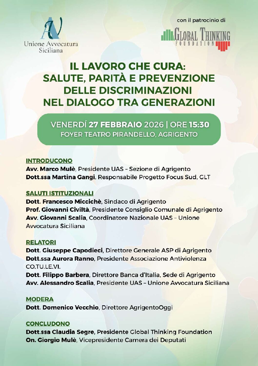 L'evento formativo "Il lavoro che cura: salute, parità e prevenzione delle discriminazioni nel dialogo tra generazioni" organizzato dall'UAS, Unione Avvocatura Siciliana ed accreditato dal Consiglio dell'Ordine degli Avvocati di Agrigento, si terrà giorno 27 febbraio 2026, alle ore 15.30, presso il Foyer del Teatro Pirandello di Agrigento. La partecipazione all'evento consente il riconoscimento di n. 3 […]